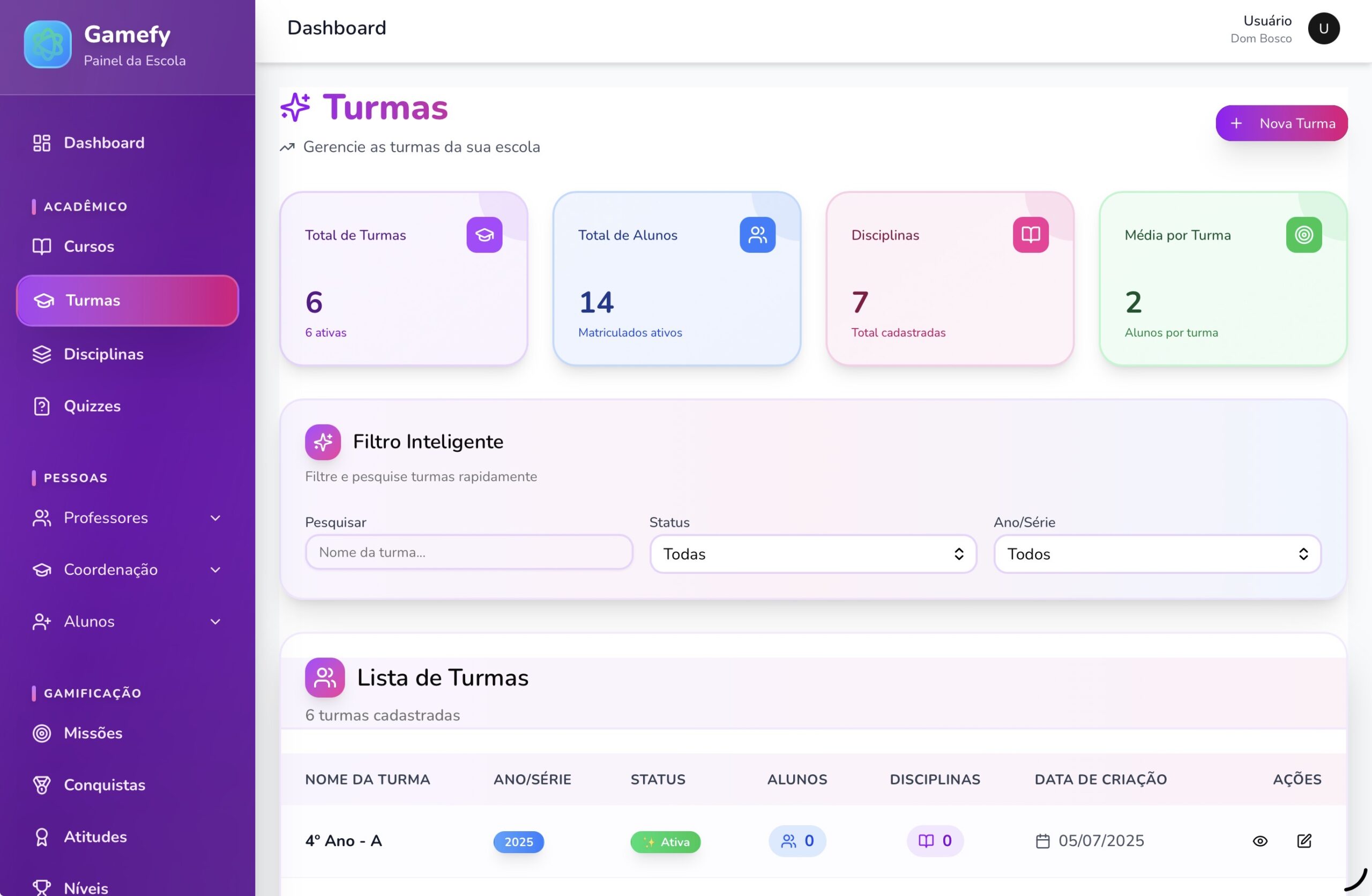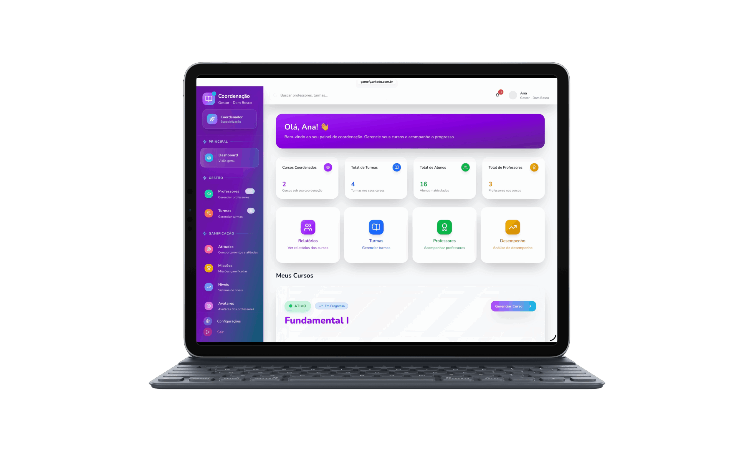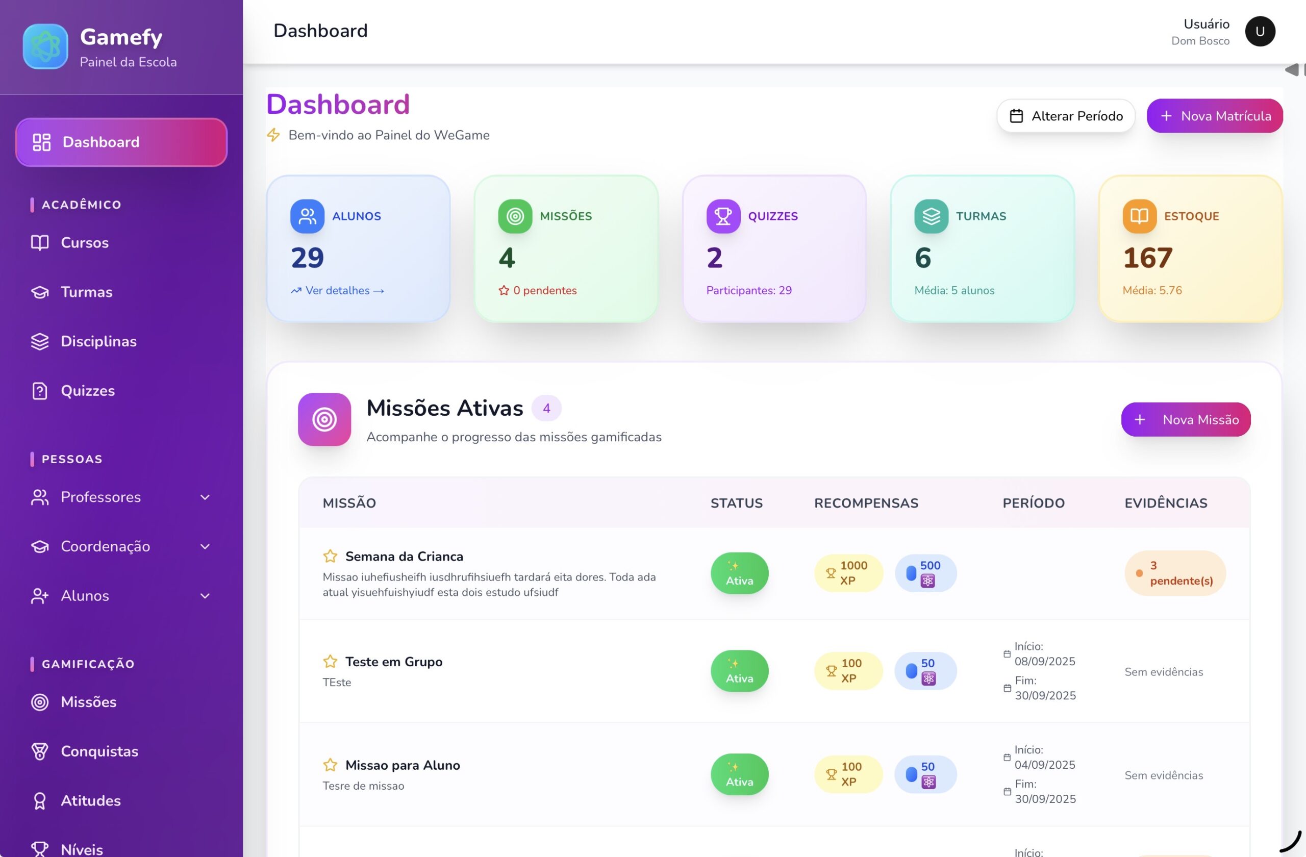 Escola, Professor, Família, Coordenação e principalmente aluno todos os níveis são gameficado para mantermos uma sinergia gamneficada.