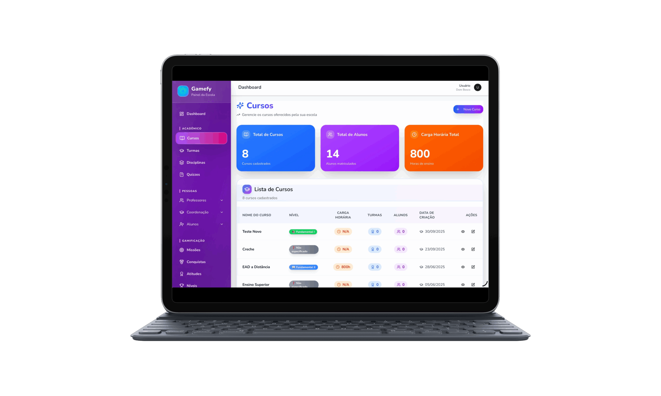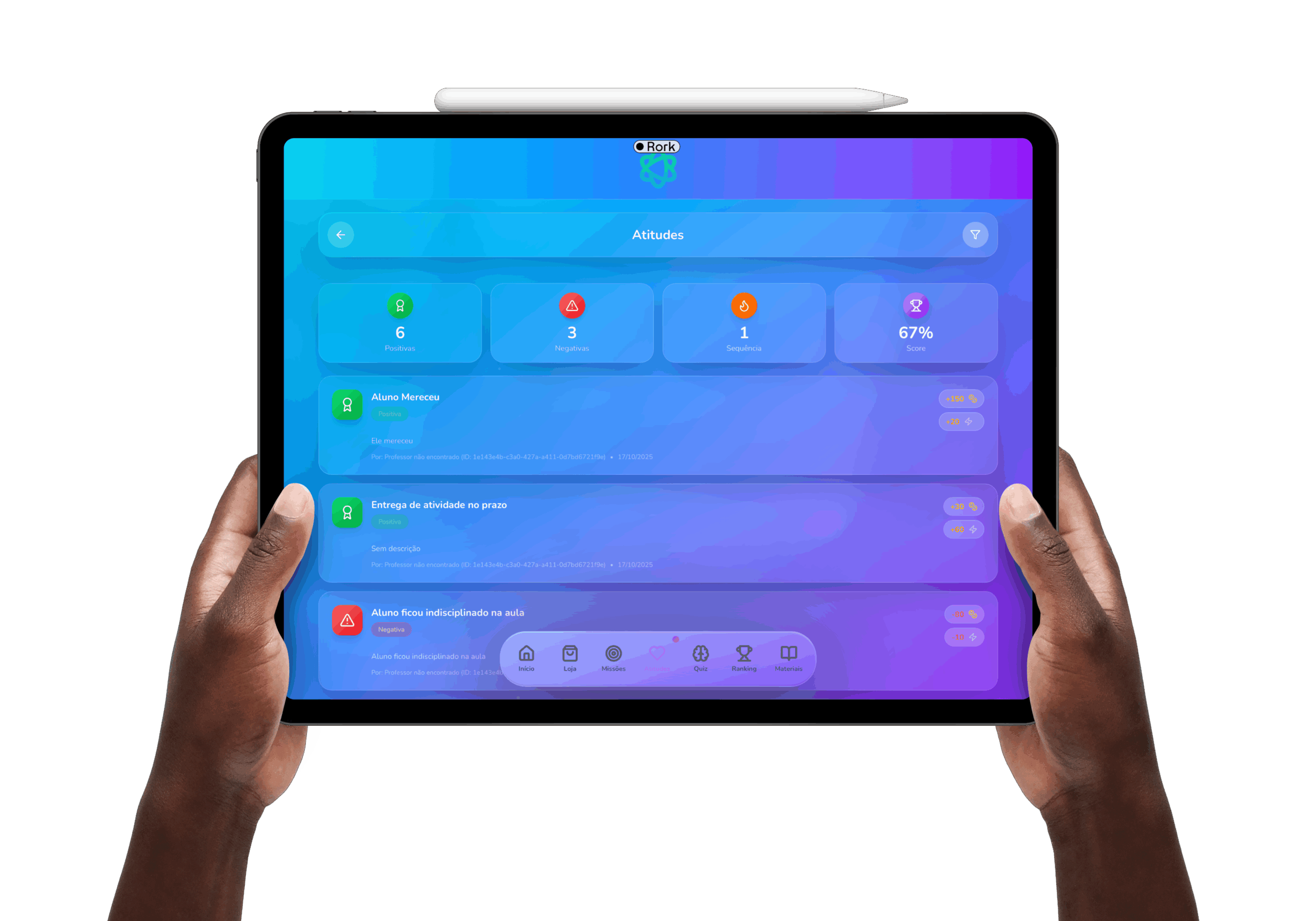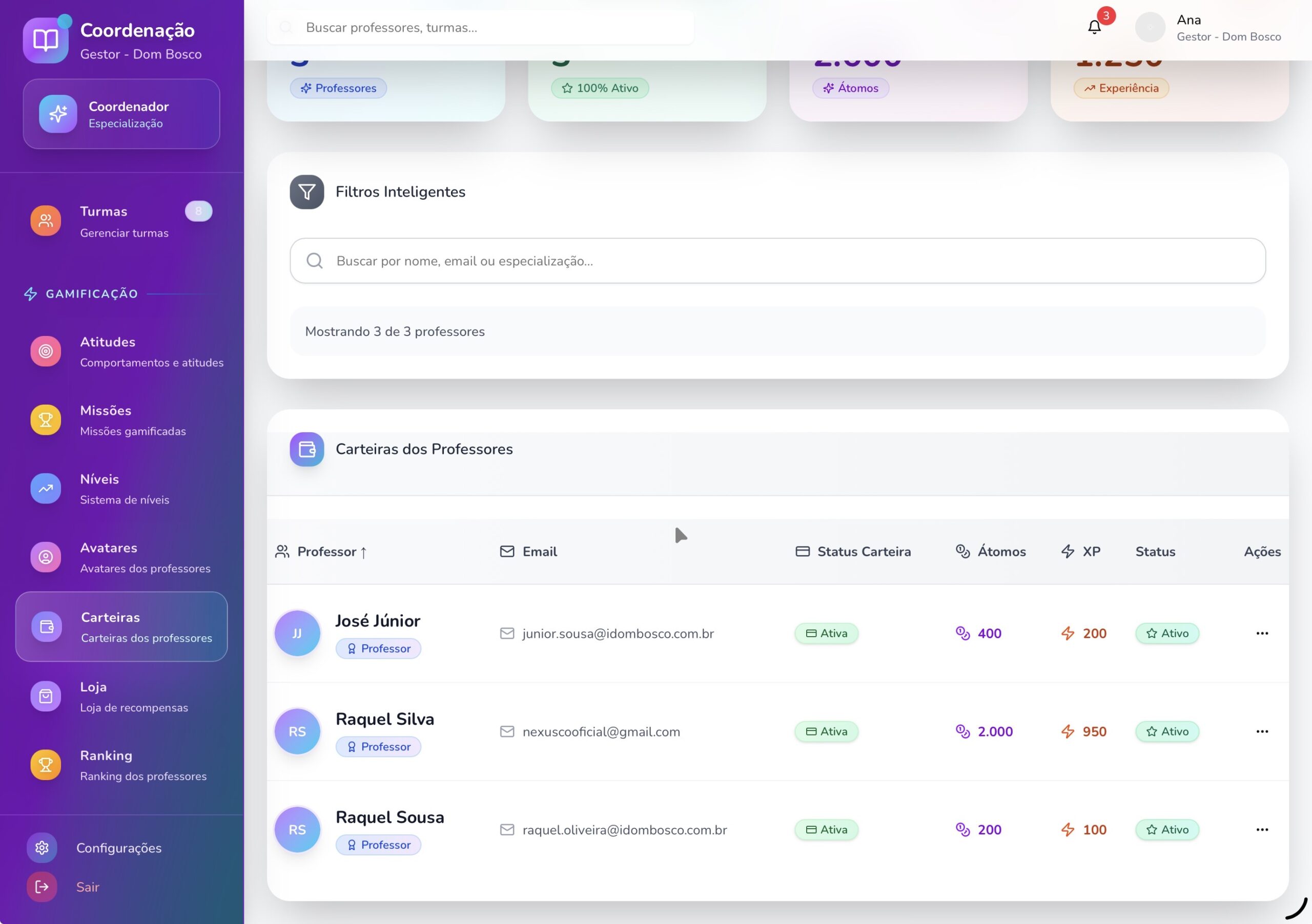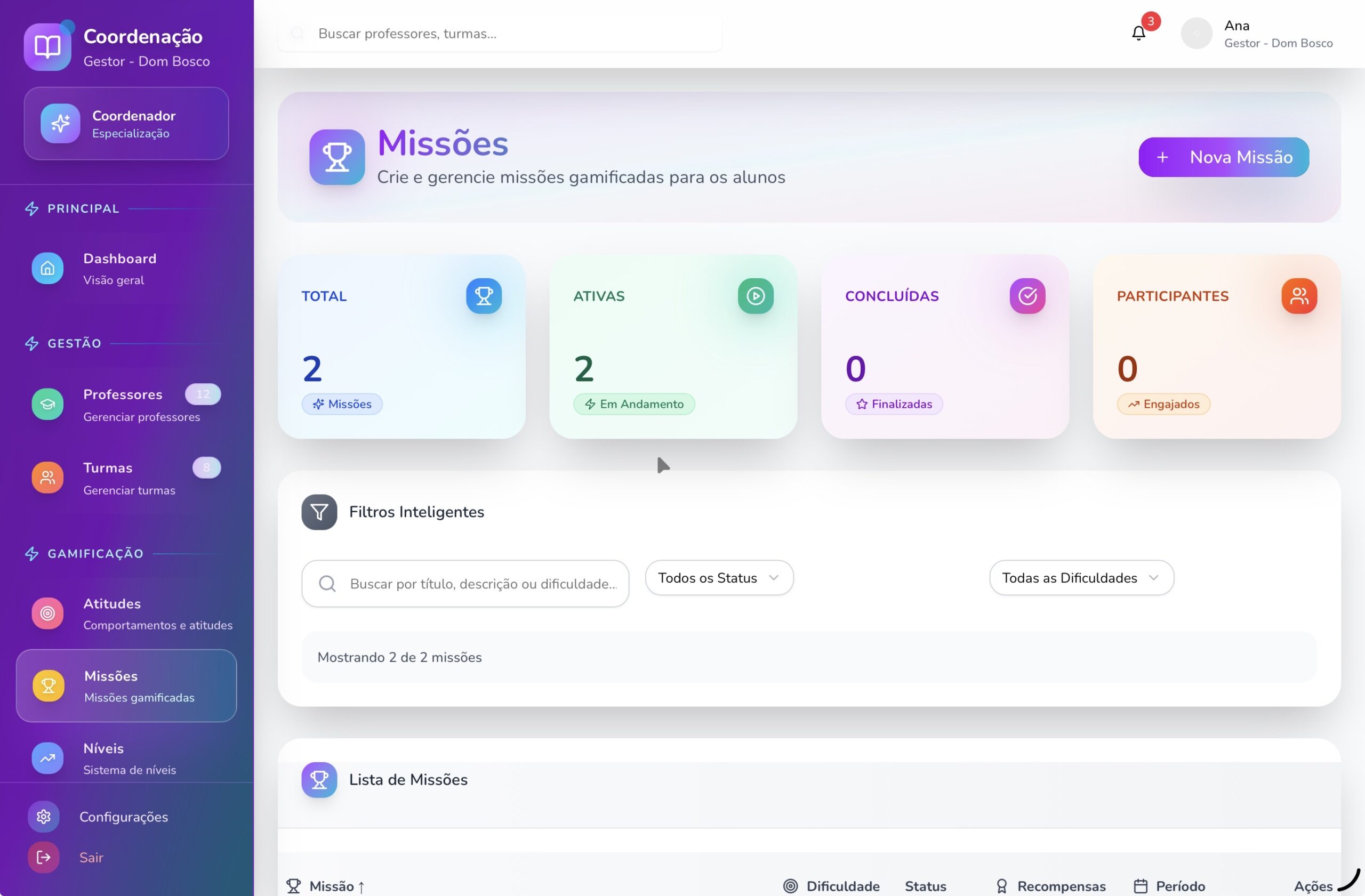 Escola, Professor, Família, Coordenação e principalmente aluno todos os níveis são gameficado para mantermos uma sinergia gamneficada.